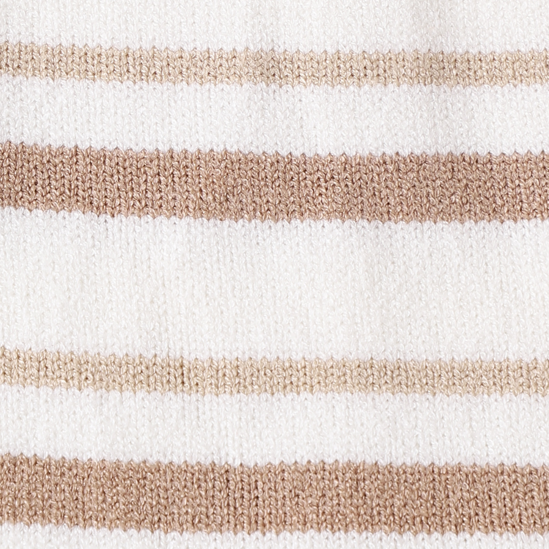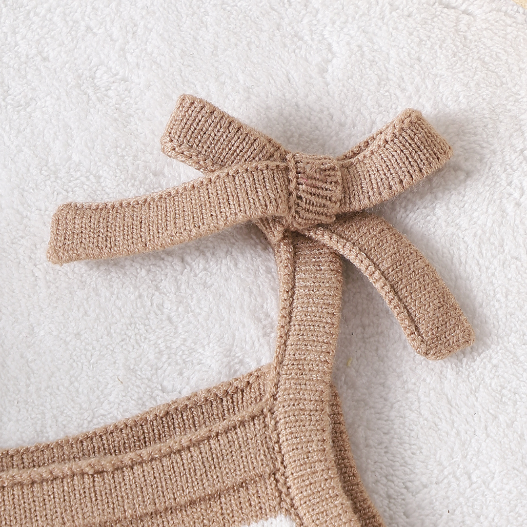 A sweet and stylish romper designed for your little one’s everyday adventures. This gorgeous knitted romper features a classic stripe pattern in warm neutral tones, finished with adorable shoulder tie straps and a gentle ruffle hem for an extra touch of charm.