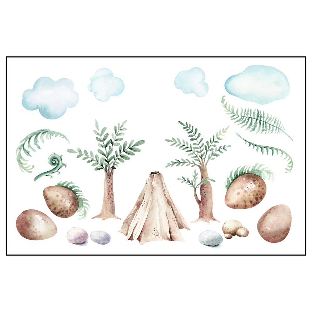 Transform your child's room into a prehistoric paradise with our Dino World Accessories Wall Decal Pack! Perfectly designed to complement our popular dinosaur wall decals, this set includes detailed trees, swirling ferns, dinosaur eggs, rocks, fluffy clouds, and a realistic volcano. Each decal is made from high-quality, PVC-free fabric with water-based inks, making them safe for kids and kind to the environment.